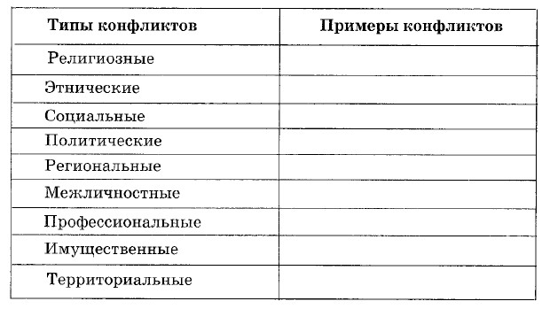 Самый трудный случай — решение межнациональных, этнических конфликтов. В большинстве межнациональных конфликтов справедливого решения для всех враждующих сторон объективно не существует, ибо каждая руководствуется своей правдой, своими историческими событиями и фактами. Пример тому — конфликт между Израилем и Палестинскими землями (см. с. 152). Понятия: конфликт. Вопросы и задания 1. Дайте развернутое определение конфликта. 2. Приведите классификацию конфликтов. 3. На примере любого конфликта выделите повод и причину. *4. Охарактеризуйте основные виды конфликтов в современной России. С какими процессами, идущими в обществе, они связаны? *5. Каким способом разрешаются конфликты? Приведите примеры решения из своей практики. Какие из способов разрешения конфликтов кажутся вам наиболее предпочтительными? Почему? *6. Что общего между следующими понятиями и чем они различаются: конфликт, драка, разборка, дуэль, ссора, диспут, война, битва? *7. К каким видам конфликтов вы отнесете шахтерские забастовки, политические перевороты, акции гражданского неповиновения, ссору из-за границы садового участка между садоводами и председателем кооператива? Проблема. Можно ли считать конфликты своеобразной «школой опыта по отстаиванию своих прав» для людей и целых государств? Практикум. Каких только конфликтов не происходило и не происходит в истории человеческого общества. Вам надо обобщить сведения о них и заполнить таблицу.