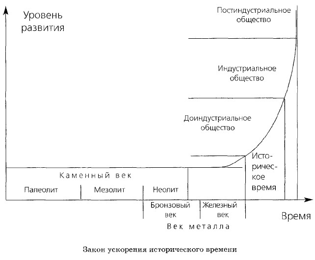 Ускорение историиПоток информации удваивается каждые 20 месяцев. Резко сокращается интервал времени между заметными изменениями в социуме. Так, люди, родившиеся в нашей стране в начале XX века, пережили практически три типа цивилизации (аграрную, индустриальную и начало постиндустриальной). Об ускорении темпов развития общества свидетельствуют такие данные. История человечества, начиная с кроманьонца до человека современного типа, насчитывает всего 1600 поколений, если считать, что новое поколение появляется каждые 25 лет. 1 200 поколений жили в пещерах, 240 — в условиях существования письменности, 22 - имели напечатанные книги. При электрическом освещении живет лишь пятое поколение. Автомобили, самолеты, радио, кинематограф начали входить в нашу жизнь всего лишь около 100 лет назад, телевидение существует 60 лет, а компьютеры менее 50 лет. «Время между появлением изобретения и его практическим использованием составляло: для бумаги - 1000 лет; паровой машины - 80 лет; телефона - 50 лет; самолета - 20; транзисторной техники - 3 года; волновых передач - 20 лет; лазеров - полгода; а факсов - всего 3 месяца». Источники: Спасибенко С.Г., Дубровина Л.К. Творчество в процессе взаимодействия общества и личности // Социально-политический журнал. 1996. N2 3. С. 50-67; Человек и общество / Под ред. В.И.Купцова. М., 1993. Кн. 1. С.4. Авдеев РФ. Философия информационной цивилизации. М., 1994.