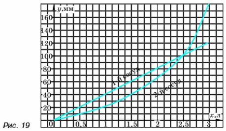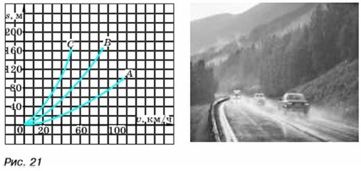 Постройте график зависимости у от x (масштаб: 1 см на оси x соответствует 1 мин, 1 см на оси у соответствует 10 °С). Используя график, ответьте на вопросы: а) какую температуру имела вода через 4 мин, через 5,5 мин, через 9 мин, через 10,7 мин после начала нагревания; б) через сколько минут после начала нагревания температура воды стала равной 41 °С; 60 °С; 95 °С? 293. (Для работы в парах.) На рисунке 21 изображены графики зависимости тормозного пути автомобиля от скорости его движения на сухом асфальте (кривая ОА)> на мокром асфальте (кривая ОВ)у при гололёде (кривая ОС). Для каждого случая ответьте на вопросы: