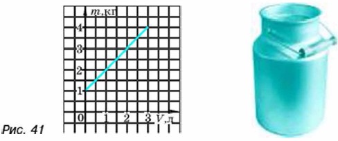 330. (Для работы в парах.) На рисунке 41 изображён график зависимости массы бидона с жидкостью от объёма жидкости. Найдите по графику: а) массу пустого бидона; б) массу бидона с одним литром жидкости; в) массу одного литра жидкости; г) объём жидкости в бидоне, если общая масса бидона с жидкостью равна 3 кг.