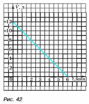 1) Выполните каждый задания а) и б). 2) Сравните полученные ответы. Исправьте ошибки, если они допущены. 3) Обсудите, как с помощью графика можно выполнить задания в) и г). 331. Из бака ёмкостью 12 л, наполненного доверху водой, равномерно вытекает вода. График зависимости V от t, где V — объём воды в баке (в литрах), a t — время вытекания воды (в минутах), построен на рисунке 42. Пользуясь графиком, найдите: