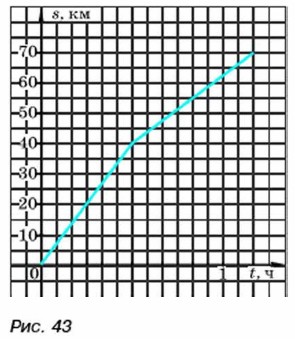 а) объём воды в баке через 3 мин; б) время, через которое в баке осталось 4 л воды; в) за какое время вытекла вся вода. 332. Дачник отправился из дома на автомобиле в посёлок. Сначала он ехал по шоссе, а затем по просёлочной дороге, сбавив при этом скорость. График движения дачника изображён на рисунке 43. Пользуясь графиком, ответьте на вопросы: