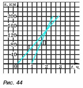 а) сколько времени ехал дачник по шоссе и сколько километров по шоссе он проехал; какая скорость автомобиля была на этом участке пути; б) сколько времени ехал дачник но просёлочной дороге и сколько километров он проехал но этой дороге; какова была скорость автомобиля на этом участке пути; в) за какое время дачник проехал весь путь от дома до посёлка? 333. В бак налили воду, температура которой 10 °С, и нагревали её до 100 °С, причём через каждую минуту температура повышалась на 1,5 °С. Задайте формулой зависимость температуры воды Т (в градусах Цельсия) от времени нагревания t (в минутах). Постройте график этой зависимости. Узнайте но графику: а) какую температуру имела вода через 5 мин; через 10 мин после начала нагревания; б) через какое время вода нагрелась до 85 °С. 334. Группа туристов отправилась со станции на турбазу. Первые 2 ч они шли со скоростью 4,5 км/ч. Затем сделали привал на 1 ч. На оставшуюся часть пути они затратили полтора часа, проходя её со скоростью 6 км/ч. Постройте график движения туристов. 335. (Для работы в парах.) На рисунке 44 изображены графики движения двух машин, следующих из города А в город В, расстояние между которыми 200 км. С помощью этих графиков ответьте на вопросы: а) какое время была в пути первая машина; вторая машина; б) какая машина начала своё движение раньше; в) с какой скоростью двигалась каждая машина; г) какая машина прибыла в город В раньше?
