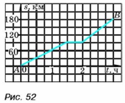 Найдите расстояние s при t, равном 347. На рисунке 52 изображён график движения автомобиля из пункта A в пункт В. Задайте эту функцию аналитически. С какой скоростью двигался автомобиль до остановки? С какой скоростью двигался автомобиль после остановки?