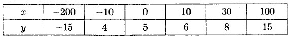 б) Известны две точки (0; 5) и (10; 6). Значит 5 = k × 0 + b ⇒ b = 5, 6 = к • 10 + b ⇒ 6 = 10k + 5 ⇒ 10k = 1 ⇒ k = 0,1. Уравнение прямой у = 0,1х + 5: при у = -15 ⇒ -15 = 0,1х + 5 ⇒ 0,1х = -20 ⇒ х = -200; при х = -10 ⇒ у = 0,1 • (-10) + 5 = -1 + 5 = 4; при х = 30 ⇒ у = 0,1 • 30 + 5 = 3 + 5 = 8; при у = 15 ⇒ 15 = 0,1х + 5 ⇒ 0,1х - 10 ⇒ х - 100.