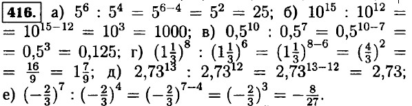 Решенния упражнений Умножение и деление степеней403. а) х5х8 = x8+5 = x13 б) а6a3 = a6+3 = x9; в) у4у9 = у9+4 = у13; г) b8b15 = b8+15 = b23; д) x9x = х9+1 = х10; е) уу12 = у1 +12 = у13; ж) 26 • 24 = 26+4 = 210; з) 75 • 7 = 75+1 = 76. 404. a) m3m8 = m3 + 8 = m11; б) х4х4 = х4+4 = х8; в) С7С12 = с7 + 12 = c19; г) p3p11 = p1 + 3 = с14; д) аа3 = a1 + 3 = а4; е) b2b = b2 + 1 = b3; ж) 59 • 58 = 59 + 8 = 517; з) 33 • 33 = 33 + 3 = 36. 405. а) а15 = а15 - 6 • а6 = а9 • а6; б) а15 = а15 -9 • а9 = а6 • а9; в) а15 = а15 - 2 • а2 = а13 • а2; г) а15 = а15 - 14 × а14 = а • а14. 406. а) x10 = x4 • х6; б) у15 = у9 • у6; в) 212 = 25 • 27; г) 517 = 58 • 59. 407. х6 = х6х0 = х5х = x4x2 = х3х3 = х2х4 = xx5 = х0х6. 408. а) х2х5х4 = х2 + 5 + 4 = х11; б) у3у2у = y3 + 2 + 1 = у6; в) mm3m2m5 = m1 + 3 + 2 + 5 = m11; г) р4р3рр = p4 + 3 + 1 + 1 = р9; д) 102 • 103 • 105 = 102 + 3 + 5 = 1010; е) 34 • 32 • 33 • 3 = 34 + 2 + 3 + 1 = 310. 409. а) m3m2m8 = m3 + 2 + 8 = m13; б) а4а3а2 = а4 + 3 + 2 = a9; в) хх4х4х = х1 + 4 + 4 + 1 = x10; г) n5nn3n6 = n5 + 1 + 3 + 6 = n15; д) 78 • 7 • 74 = 78 + 1 + 4 = 713; е) 5 • 52 • 53 • 55 = 51 + 2 + 3 + 5 = 511. 410. а) 58 • 25 = 58 • 52 = 58 + 2 = 510; б) 312 • 27 = 312 × 33 = 312 + 3 = 315; в) б15 • 36 = 615 • 62 = 615 + 2 = 617; г) 29 • 32 = 29 • 25 = 29 + 5 = 214; д) 0,45 • 0,16 = 0,45 × 0,42 = 0,45 + 2 = 0,47; е) 0,001 • 0,14 = 0,13 • 0,14 = 0,13 + 4 = 0,17. 411. а) 24 • 2 = 24 + 1 = 25 = 32; б) 26 • 4 = 26 • 22 = 26 + 2 = 28 = 256; в) 8 • 27 = 23 • 27 = 23 + 7 = 210 = 1024; г) 16 • 32 = 24 • 25 = 24 + 5 = 29 = 512. 412. а) 32 • З5 = 32 + 5 = З7 = 2187; б) 81 • 36 = 34 • 36 = 34 + 6 = 310 = 59049; в) 9 • 2187 = 32 • 37 = 32 + 7 = З9 = 19683; г) 27 • 243 = 33 • 35 = З3 + 5 = З8 = 6561. 413. а) (с4)2 = с4 • с4 = с4 + 4 = с8; б) (с2)4 = с2 • c2 × c2 • С2 = с2 + 2 + 2 + 2 = c8. 414. а) х5 : х3 = х5 - 3 = х2; б) у10 : у7 = у10 - 7 = у3; в) a21 : а = а21 - 1 = а20; г) b19 : b18 = b19 - 18 = b; д) с12 : с3 = с12 - 3 = с9; е) р20 : р10 = р20 - 10 = р10; ж) 38 : 35 = З8 - 5 = З3; з) 0,79 : 0,74 = 0,79 - 4 = 0,75. 415. а) р10 : р6 = р10 - 6 = р4; б) а8 : а4 = а8 - 4 = а4; в) х15 : х4 = х15 - 4 = х11; г) у9 : у = р9 - 1 = р8; д) 1016 : 1012 = 1016 - 12 = 104; е) 2,316 : 2,37 = 2,316 - 7 = 2,39.