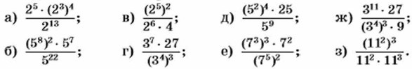 § 7. Степень и ее свойства Возведение в степень произведения и степени (окончание)441. Представьте в виде степени с основанием а: а) аnа3; б) ааm; в) а2аm; г) (a2)m; д) (an)3; е) (а3)n. 442. Представьте в виде степени с основанием 5 число: а) 254; б) 1253; в) 6252. 443. Представьте число 220 в виде степени с основанием: а) 22; б) 24; в) 25; г) 210. 444. Запишите число 260 в виде степени с основанием: а) 4; б) 8; в) 16; г) 32. 445. Выражение а12 представьте в виде степени несколькими способами. 446. Известно, что а2 = m. Найдите а6. 447. Упростите выражение: