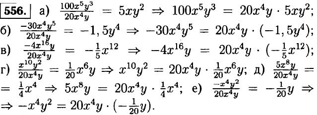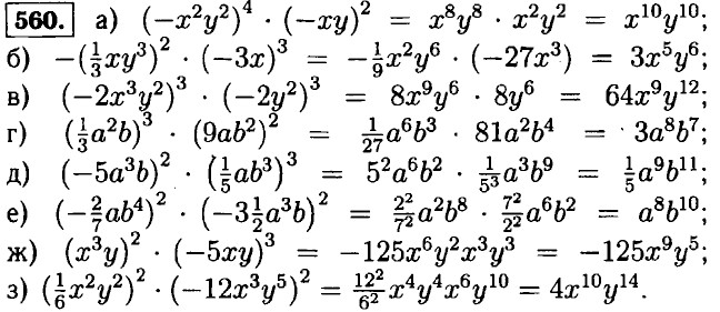 557. а) -8а5с3 = -ас • 8а4c2; б) -b6y9 = -by8 • b5у; в) 60х10у15 = 20x5у5 • 3х5у10. 558. a) (-10ab12)2 = 100a2b12 • 2 = 100а2b24; б) (-0,2 х4у)4 = 0,0016x4 • 4y4 = 0,0016x16y4; в) (-3ху2а3)3 = -27х3у2 • 3а3 • 3 = -27х3у6а9; г) (-0,5аb2с3)4 = 0,0625а4b2 • 4с3 • 4 = 0,0625а4b8с12.