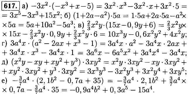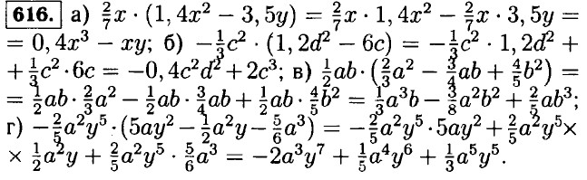Ðåøåííèÿ óïðàæíåíèé Óìíîæåíèå îäíî÷ëåíà íà ìíîãî÷ëåí614. à) 2õ • (õ2 - 7õ - 3) = 2õ • õ2 - 2õ • 7õ - 2õ • 3 = 2x3 - 14x2 - 6x; á) -4b2 • (5b2 - 3b - 2) = -4b2 • 5b2 + 4b2 • 3b + 4b2 • 2 = -20b4 + 12b3 + 8b2; â) (3à3 - à2 + à)(-5à3) = -3à3 • 5à3 + à2 • 5à3 - à • 5à3 = -15à6 + 5à5 - 5à4; ã) (ó2 - 2,4ó + 6) • 1,5ó = ó2 • 1,5ó - 2,4ó • 1,5ó + 6 • 1,5ó = 1,5ó3 - 3,6ó2 + 9ó; ä) —0,5x2 • (-2x2 - 3x + 4) = 0,5õ2 • 2õ2 + 0,5x2 • 3x - 0,5x2 • 4 = x4 + 1,5õ3 - 2x2; å) (-3ó2 + 0,6ó)(-1,5ó3) = 3ó2 • 1,5ó3 - 0,6ó • 1,5ó3 = 4,5ó5 - 0,9ó4. 615. à) 3àb • (à2 - 2àb + b2) = 3àb • à2 - 3àb • 2àb + 3àb • b2 = 3à3b - 6à2b2 + 3àb3; á) -õ2ó • (õ2ó2 - õ2 - ó2) = -õ2ó • õ2ó2 + õ2ó • õ2 + õ2ó • ó2 = -õ4ó3 + õ4ó + õ2ó3; â) 2,5à2b • (4à2 - 2àb + 0,2b2) = 2,5à2b • 4à2 - 2,5à2b • 2àb + 2,5à2b • 0,2b2 = 10à4b - 5à3b2 + 0,5à2b3; ã) (-2àõ2 + 3àõ - à2)(-à2õ2) = 2àõ2 • à2x2 - 3àx • à2õ2 + à2 • à2õ2 = 2à3õ4 - 3à3õ3 + à4õ2; ä) (6,3õ3ó - 3ó2 - 0,7õ) • 10õ2ó2 = 6,3õ3ó • 10x2ó2 - 3ó2 • 10x2ó2 - 0, 7õ • 10õ2ó2 = 63õ5ó3 - 30õ2ó4 - 7õ3ó2; å) -1,4p2q6 • (5p3q - 1,5pq2 - 2q3) = -1,4p2y6 • 5p3q + 1,4p2q6 • 1,5pq2 + 1,4p2q6 • 2q3 = -7p5q7 + 2,1p3q8 + 2,8p2q9.