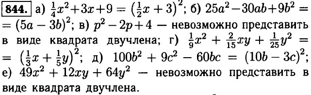 837. а) (3b + 2а)2 = 9b2 + 12аb + 4а2; б) (3x + 7у)2 = 9x2 + 42xу + 49у2. 838. а) b2 + 20b + 100 = (b + 10)2; б) b2 + 14b + 49 = (b + 7) ; в) 16x2 + 24xу + 9у2 = (4x + 3у) ; г) 9р2 - 42ру + 49у2 = (3р - 7у)2. 839. а) -1 + 4а - 4а 2= -(1 - 4а + 4а2) = -(1 - 2а)2; б) -42а + 9а2 + 49 = (3а - 7)2; в) 24аb - 16а2 - 9b2 = -(16а2 - 24аb + 9b2) = -(4а - 3b)2; г) -44аx + 121а2 + 4x2 = (11а - 2x)2; д) 4cd - 25с2 - 0,16d2 = -(25с2 - 4cd + 0,16d2) = -(5с - 0,4d)2; е) -0,49x2 - 1,4xу - у2 = -(0,49x2 + 1,4xу + у2) = -(0,7л + у)2. 840. а) у2 - 2у + 1 = (у - 1)2: при у = 101 ⇒ (у - 1)2 = (101 - 1)2 = 1002 = 10000; при у = -11 ⇒ (у - 1)2 = (-11 - 1)2 = (-12)2 = 144; при у = 0,6 ⇒ (у - 1)2 = (0,6 - 1)2 = (-0,4)2 = 0,16; б) 4x2 - 20x + 25 = (2x - 5)2: при x = 12,5 ⇒ (2x - 5)2 = (2 • 12,5 - 5)2 = 202 = 400; при x = 0 ⇒ (2x - 5)2 = (2 • 0 - 5)2 = (-5)2 = 25; при х = -2 ⇒ (2x - 5)2 = (2 • (-2) - 5)2 = (-4 - 5)2 = (-9)2 = 81; в) 25а2 + 49 + 70а = (5а + 7)2: при а = 0,4 ⇒ (5а + 7)2 = (5 • 0,4 + 7)2 = (2 + 7)2 = 92 = 81; при а = -2 ⇒ (5а + 7)2 = (-2 • 5 + 7)2 = (-10 + 7)2 = • (-3)2 = 9; при а = -1,6 ⇒ (5а + 7)2 = (-1,6 • 5 +7)2 = (-8 + 7)2 = 1. 841. а) верно; б) x2 + 20x + 100 = (x + 10)2 ≥ 0: при x = -10; (x + 10)2 = 0 — не верно. 842. а) x2 - 30x + 225 - (x - 15)2 ≥ 0; б) -x2 + 2xу - у2 = -(x2 - 2xу + у2) = -(x - у)2 ≤ 0. 843. a) x2 - 16x + 64 = (x - 8)2 ≥ 0; 6) 16 +8x + x2 = (4 + x)2 ≥ 0; в) -x2 - 4x - 4 = -(x2 + 4x + 4) = -(x + 2)2 ≤ 0; г) -x2 + 18x - 81 = -(x2 - 18x + 81) = -(x - 9)2 ≤ 0.
