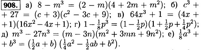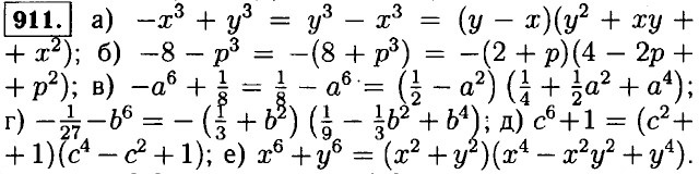 909. a) x3 - у6 = (x - y2)(x2 + xy2 + у4); б) a6 + b3 = (a2 + b)(a4 - a2b + b2); в) m9 - n3 - (m3 - n)(m6 + m3n + n2); г) p3 + k9 = (p + k3)(p2 - pk3 + k6); д) a6 + b9 = (a2 + b3)(a4 - a2b3 + 66); e) x9 - y9 = (x3 - y3)(x6 + x3у3 + y6). 910. a) c3 + 66 = (c + b2)(c2 - cb2 + 4); 6) a9 - b6 = (a3 - b2)(a6 + a3b2 + b4); в) x6 - 8 = (x2 - 2)(x4 + 2x2 + 4); г) 27 + у9 = (3 + y3)(9 - 3y3 + y6).
