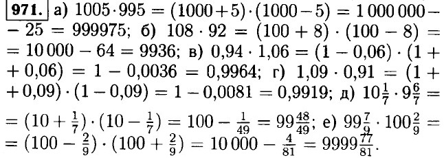 972. a) 5у • (у2 - 3)(y2 + 3) = 5у • (у4 - 9) = 5y5 - 45у; б) -8х • (4х - х3)(4х + х3) = -8х • (16x2 - x6) = 8х7 - 128x3; в) (а4 - 3)(а4 + 3)(а8 + 9) = (а8 - 9) (а8 + 9) = а16 - 81; г) (1 - b3)(1 + b3)(1 + b6) = (1 - b6)(1 + b6) = 1 - b12. 973. а) (а + 2)(а - 2) - а • (а - 5) - а2 - 4 - а2 + 5а = 5а - 4; б) (а - 3)(3 + а) + а • (7 - а) = а2 - 9 + 7а - а2 = 7а - 9; в) (b - 4)(b + 4) - (b - 3)(b + 5) = b2 - 16 - b2 - 5b + 3b + 15 = -2b - 1; г) (b + 8)(b - 6) - (b - 7)(b + 7) = b2 - 6b + 8b - 48 - b2 + 49 = 2b + 1; д) (с - 1)(с + 1) + (с - 9)(с + 9) = с2 - 1 + с2 - 81 = 2с2 - 82; е) (5 + с)(с - 5) - (с - 10)(с + 10) = с2 - 25 - с2 + 100 = 75.