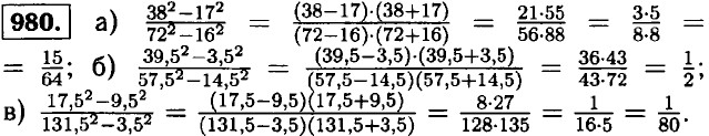 975. а) (х - 5)2 + 2х • (х - 3) = х2 -10х + 25 + 2x2 - 6х = 3х2 - 16х + 25; б) (у + 8)2 - 4у • (у - 2) = у2 + 16у + 64 - 4у2 + 8у = -3у2 + 24у + 64; в) (а - 4)(а + 4) + (2а - 1)2 = а2 - 16 + 4а2 - 4а + 1 = 5а2 - 4а - 15; г) (6 - 3)(6 + 3) - (b + 2)2 = b2 - 9 - b2 - 4b - 4 = -4b - 13; д) (2а - 5)2 - (5а - 2)2 = 4а2 - 20а + 25 - 25а2 + 20а - 4 = -21а2 + 21; е) (3b - 1)2 + (1 - 3b)2 = 2(3b - 1)2 - 18b2 - 12b + 2; ж) (2х + 1)2 - (х + 7)(х - 3) = 4х2 + 4х + 1 - х2 + 3х - 7х + 21 = 3х2 + 22; з) (3у - 2)2 - (у - 9)(9 - у) = (3у - 2)2 + (у - 9)2 = 9у2 - 12 у + 4 + у2 - 18у + 81 = 10у2 - 30у + 85. 976. 2 • (х + 2)(х - 2) + 16 - (х + 2)2 + (х - 2)2 ⇒ 2х2 - 8 +16 = х2 + 4х + 4 + х2 - 4х + 4 ⇒ 2х2 + 8 = 2х2 + 8 — равенство выполняется при любом х. 977. а) (х + у + 1)(х + у - 1) = (х + у)2 - 1 = х2 + 2ху + у2 - 1; б) (m + n - 3)(m + n + 3) = (m + n) - 9 = m2 + 2mп + n2 - 9; в) (a - b - 5)(a - b + 5) = (a - b)2 - 25 = a2 - 2ab + b2 - 25; г) (c - d + 8)(c - d - 8) = (c - d)2 - 64 = c2 - 2cd + d2 - 64; д) (p + 2q - 3)(p - 2q - 3) = (p - 3)2 - 4q2 = p2 - 6p + 9 - 4q2; e) (a - 3x + b)(a + 3x + b) = (a + b)2 - 9x2 = a2 + 12a + + 36 - 9x2. 978. а) (x - 7)2 + 3 = (x - 2)(x + 2) ⇒ x2 - 14x + 49 + 3 = x2 - 4 ⇒ 14x = 56 ⇒ x = 4; 6) (x + 6)2 - (x - 5)(x + 5) = 79 ⇒ x2 + 12x + 36 - x2 + 25 = 79 ⇒ 12x = 18 ⇒ x = 1,5; в) (2x - 3)2 - (7 - 2x)2 = 2 ⇒ 4x2 - 12x + 9 - 49 + 28x - 4x2 = 2 ⇒ 16x = 42 = x = г) (5x - 1)2 - (1 - 3x)2 = 16x • (x - 3) ⇒ 25x2 - 10x + 1 - 1 + 6x - 9x2 = 16x2 - 48x ⇒ 44x = 0 ⇒ x = 0.