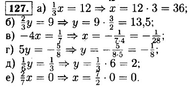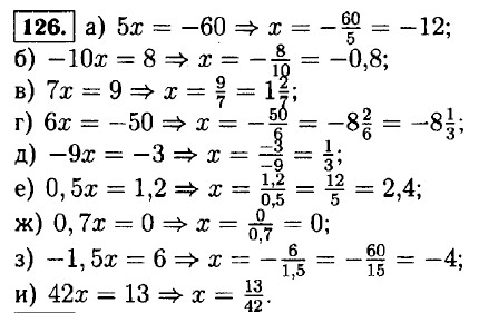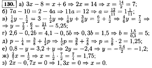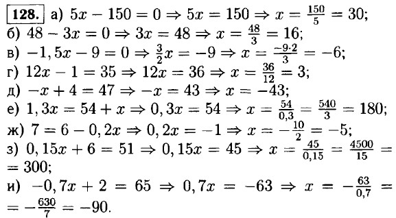 131. а) (у + 4) - (у - 1) = 6y ⇒ у + 4 - у + 1 = 6у ⇒ 6у = 5 ⇒ 132. а) (13x - 15) - (9 + 6x) = -3x ⇒ 13х - 15 - 9 - 6x + 3х = 0 ⇒ 10x = 24 ⇒ х = 2,4; б) 12 - (4x - 18) = (36 + 4x) + (18 - 6x) ⇒ 12 - 4х + 18 = 36 + 4х + 18 - 6х ⇒ 4х - 6х + 4х = 18 + 12 - 36 - 18 ⇒ 2х = -24 ⇒ х = -12. в) 1,6х - (х - 2,8) = (0,2х + 1,5) - 0,7 ⇒ 1,6х - х +2,8 = 0,2х + 1,5 - 0,7 ⇒ 1,6х - х - 0,2х = 1,5 - 0,7 - 2,8 ⇒ 0,4х = -2 ⇒ х = г) (0,5х + 1,2) - (3,6 - 4,5х) - (4,8 - 0,3х) + (10,5х + 0,6) ⇒ 0,5х + 1,2 - 3,6 + 4,5х = 4,8 - 0,3х +10,5х + 0,6 ⇒ 10,5х - 0,3х - 4,5х - 0,5х = 1,2 - 3,6 - 4,8 - 0,6 ⇒ 5,2х = -7,8 ⇒ х = 133. а) 5х + (3х - 3) = 6x +11 ⇒ 5х = 3х-3 = 6x + 11. 8х - 6х = 11 + 3 ⇒ 2х = 14. x = 7. б) 3а - (10 + 5а) = 54 ⇒ 3а - 10 - 5а = 54. -2а = 64 ⇒ а = -32. в) (х - 7) - (2х + 9) = -13 ⇒ х - 7 - 2х - 9 = -13. -x - 16 = -13 ⇒ x = -3. <<< К началу Решенния (окончание) >>>