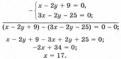 Глава 3. Системы двух линейных уравнений с двумя переменными § 14. Системы двух линейных уравнений с двумя переменными как математические модели реальных ситуаций (окончание)В чисто учебных целях решим эту систему двумя способами. Первый способ. Применим метод подстановки. Из первого уравнения системы находим х = 2у - 9. Подставим этот результат вместо х во второе уравнение системы. Получим 3(2у - 9) - 2у - 25 = 0; 4у = 52; y = 13. Так как х = 2у - 9, то х = 2 • 13 - 9 = 17. Итак, х = 17, у = 13 — решение системы. Второй способ. Применим метод алгебраического сложения: