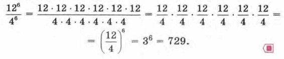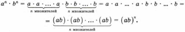 Глава 4. Степень с натуральным показателем и её свойства § 18. Умножение и деление степеней с одинаковыми показателямиВ предыдущем параграфе мы рассматривали умножение и деление степеней с одинаковыми основаниями. Оказывается, можно умножать и делить степени и с разными основаниями, если только показатели у этих степеней одинаковые. Пример 1. Вычислить 24 • 54. Р е ш е н и е. Конечно, можно по таблице из § 16 установить, что 24 = 16 , 54 = 625, а затем умножить 16 на 625. Однако эффективнее следующее рассуждение: 24 • 54 = (2 • 2 • 2 • 2) • (5 • 5 • 5 • 5) = (2 • 5) • (2 • 5) • (2 • 5) • (2 • 5) = (2 • 5)4 = 104 = 10 000. В процессе решения мы получили числовое равенство 24 • 54 = (2 • 5)4. Точно так же можно доказать, что а3b3 = (аb)3. В самом деле, а3b3 = (а • а • а) • (b • b • b) = ab • ab • ab = (ab)3. Вообще имеет место равенство аnbn = (аb)n. Для тех, кому интересно, приведём «молчаливое» доказательство этого утверждения. Попробуйте его «озвучить» и прокомментировать: