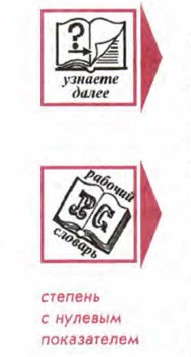 В дальнейшем вы узнаете, что показателем степени может быть не только натуральное число. Но это произойдёт позднее, в старших классах, а пока мы сделаем лишь один скромный шаг в этом направлении: введём понятие степени с нулевым показателем, т. е. выясним, какой смысл придаётся в математике символу а0. А ведь этот символ «напрашивается». Смотрите: 25 : 23 = 25 - 3 = 22, 38 : 3 = 38 - 1 = 37. Почему бы не написать 54 : 54 = 54 - 4 = 50? До сих пор всё было хорошо: а3 — это значит число а умножить само на себя 3 раза, а10 — это значит число а умножить само на себя 10 раз, а1 — это просто а. А что такое а0? Ведь нельзя же, в самом деле, умножить число а само на себя 0 раз! Хотелось бы, чтобы для а0 выполнялись привычные правила, например, чтобы при вычислении а3 • а0 показатели складывались: а3 • а° = а3 + 0. Но 3 + 0 = 3. Что же получается? Получается, что а3 • а0 = а3. Значит, а0 = а3 : а3 = 1 (при этом нужно ввести естественное ограничение: а ≠ 0). Проведённое рассуждение как- то мотивирует следующее определение. Определение. Если а ≠ 0, то а0 = 1. Например, (5,7)0 = 1; (-3)0 = 1; (2n)0 = 1 и т. д. Однако учтите, что символ 0° считается в математике не имеющим смысла. Вопросы для самопроверки 1. Сформулируйте определение степени с нулевым показателем. 2. Сравните: (987 654 321)0 и 0987 654 321. 3. Как вы думаете, можно ли отрицательное число возвести в нулевую степень? 4. Как вы думаете, почему запись 00 считается в математике лишённой смысла?