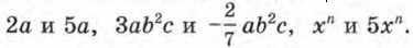 Определение. Два одночлена, состоящие из одних и тех же переменных, каждая из которых входит в оба одночлена в одинаковых степенях (т. е. с равными показателями степеней), называют подобными одночленами. Примеры подобных одночленов:
