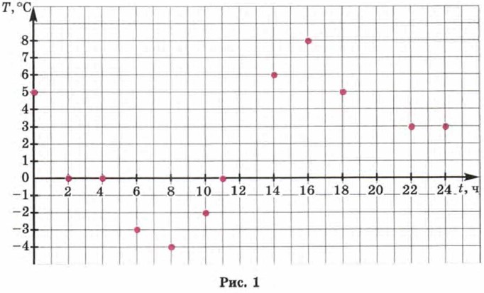 Р е ш е н и е. Построим прямоугольную систему координат. По горизонтальной оси (оси абсцисс) будем откладывать значения времени, а по вертикальной оси (оси ординат) — значения температуры. Построим на координатной плоскости точки, координатами которых являются соответствующие числа из таблицы. Всего получается 12 точек (рис. 1). Соединив их плавной линией, получим один из возможных графиков температуры (рис. 2).