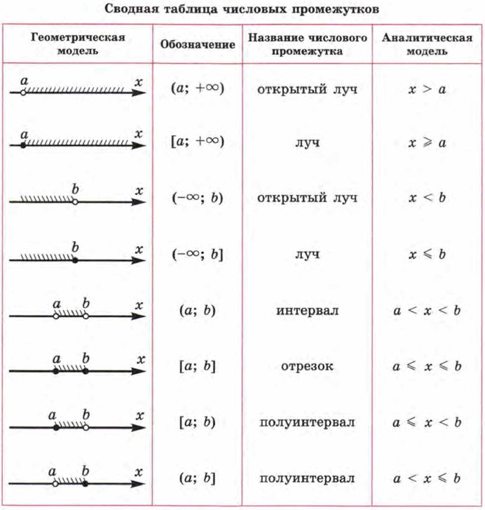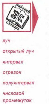 Итак, мы ввели пять новых терминов математического языка: луч, открытый луч, интервал, отрезок, полуинтервал. Есть и общий термин: числовой промежуток. Сама координатная прямая также считается числовым промежутком; для неё используют обозначение (-∞; +∞).
