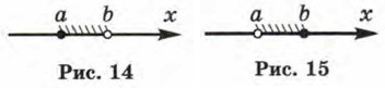 А что получится, если к интервалу (a; b) добавить только один конец — только точку а (рис. 14) или только точку b (рис. 15)? Получится полуинтервал, который в первом случае обозначают [a; b), а во втором — (а; b] и который характеризуется с помощью двойных неравенств: а ≤ х < b — в первом случае, а < х ≤ b — во втором случае.