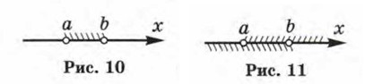 Глава 1. Математический язык. Математическая модель § 5. Координатная прямая (окончание)3. Пусть на координатной прямой отмечены точки а и b, причём a < b (т.е. точка а расположена на прямой левее точки b). Рассмотрим все точки, которые лежат правее точки а, но левее точки b; отметим соответствующую часть координатной прямой штриховкой (рис. 10). Это множество точек (чисел) называют интервалом и обозначают (а; b). Оно характеризуется строгим двойным неравенством а < х < b (под х понимается любая точка интервала).