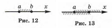 Обратите внимание: интервал (а; b) есть пересечение (общая часть) двух открытых лучей (-∞; b) и (а; +∞) — это хорошо видно на рисунке 11. Если к интервалу (а; b) добавить его концы, т. е. точки а и b, то получится отрезок [а; b] (рис. 12), который характеризуется нестрогим двойным неравенством а ≤ х ≤ b. Обратите внимание: в обозначении отрезка используют не круглые скобки, как это было в обозначении интервала, а квадратные; на чертеже точки а и b отмечены тёмными кружками, а не светлыми, как это было в случае интервала.