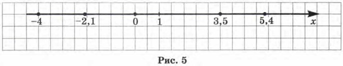 Прямую l, на которой выбрана начальная точка О (начало отсчёта), масштаб (единичный отрезок, т. е. отрезок, длина которого считается равной единице) и положительное направление, называют координатной прямой или координатной осью (рис. 3); употребляют также термин «ось х» («ось у», «ось г» и т. д.). Каждому числу соответствует единственная точка координатной прямой. Например, числу 3,5 соответствует точка М (рис. 4), которая удалена от начала отсчёта, т. е. от точки О, на расстояние, равное 3,5 (в заданном масштабе), и отложена от точки О в заданном (положительном) направлении. Числу -4 соответствует точка Р (см. рис. 4), которая удалена от точки О на расстояние, равное 4, и отложена от точки О в отрицательном направлении, т. е. в направлении, противоположном заданному.
