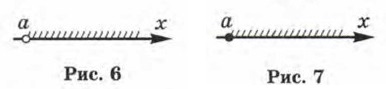 Обратите внимание: точка а открытому лучу не принадлежит. Если же эту точку надо присоединить к открытому лучу, то пишут х > а или [а; +∞) (перед а ставят не круглую, а квадратную скобку), а на чертеже такую точку обозначают не светлым, как на рисунке 6, а закрашенным кружком (рис. 7). Если про множество точек (а; +∞) говорят, что это — открытый луч, то для множества точек [а; +∞) употребляют термин луч (без прилагательного «открытый»).