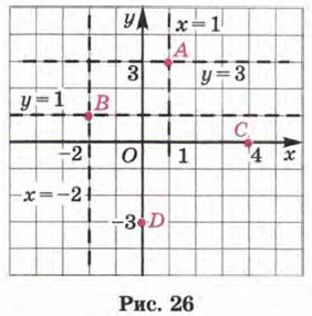 Пример. В системе координат хОу построить точки: А(1; 3), В(-2; 1), С(4; 0), D(0; -3). Р е ш е н и е. Точка А есть точка пересечения прямых х = 1 и у = 3 (рис. 26).