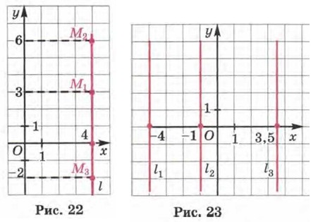 Глава 2. Линейная функция § 6. Координатная плоскость (окончание)Итак, как находить координаты точки в координатной плоскости, мы обсудили. А как решать обратную задачу, т. е. как, задав координаты, построить соответствующую точку? Чтобы выработать алгоритм, проведём два вспомогательных, но в то же время важных рассуждения. Первое рассуждение. Пусть в системе координат хОу проведена прямая l, параллельная оси у и пересекающая ось х в точке с координатой (абсциссой) 4 (рис. 22). Любая точка, лежащая на этой прямой, имеет абсциссу 4. Так, для точек M1, М2, М3 имеем М1(4; 3), М2(4; 6), М3(4; -2). Иными словами, абсцисса любой точки М прямой l удовлетворяет условию х — 4. Если же взять точку, не лежащую на этой прямой, то её абсцисса будет отлична от 4. Говорят, что х = 4 — уравнение прямой l или что прямая l (и только она) удовлетворяет уравнению х = 4.