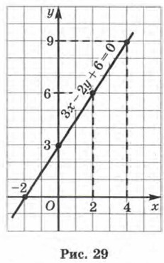 Пример 2. Построить график уравнения 3x - 2у + 6 = 0. Р е ш е н и е. Подберём несколько решений заданного уравнения: 1) (0; 3); в самом деле, если х = 0, у = 3, то 3 • 0 - 2 • 3 + 6 = 0 — верное равенство (в уравнение 3x - 2у + 6 = 0 мы подставили значения х = 0, у = 3); 2) (-2; 0); действительно, если х = -2, у = 0, то 3 • (-2) - 2 • 0 + 6 = 0 — верное равенство; 3) (2; 6); если x = 2, y = 6, то 3 • 2 - 2 • 6 + 6 = 0 — верное равенство; 4) (4; 9); если х = 4, у = 9, то 3 • 4 - 2 • 9 + 6 = 0 — верное равенство.