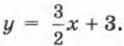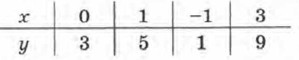 Таким образом, линейное уравнение (1) с двумя переменными х и у в случае, когда b ≠ 0, можно преобразовать к виду у = kx + m, (2) где k, m — числа (коэффициенты). Это частный вид линейного уравнения. Зная, чему равен х, по правилу у = kx + m всегда можно найти, чему равен у. Будем называть уравнение (2) линейной функцией. С помощью уравнения (2) легко, указав конкретное значение х, вычислить соответствующее значение у. Пусть, например, у = 2х + 3. Тогда если х = 0, то у = 3; если х = 1, то у = 5; если х = -1, то у = 1; если х = 3, то у = 9 и т. д. Обычно эти результаты оформляют в виде таблицы: