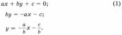 Глава 2. Линейная функция § 8. Линейная функция и её графикАлгоритм построения графика уравнения ах + by + с = 0, который мы сформулировали в § 7, при всей его чёткости и определённости математикам не очень нравится. Обычно они выдвигают претензии к первым двум шагам алгоритма. Зачем, говорят они, дважды решать уравнение относительно переменной у: сначала ах1 + by + с - 0, затем ах2 + by + с = 0? Не лучше ли сразу выразить у из уравнения ах + by + с = 0, тогда легче будет проводить вычисления (и, главное, быстрее)? Давайте проверим. Рассмотрим сначала уравнение 3x - 2у + 6 = 0 (см. пример 2 из § 7), т. е. 2у = 3х + 6. Умножив обе части уравнения на Итак, Придавая х конкретные значения, легко вычислить соответствующие значения у. Например, при x = 0 получаем у = 3; при х = -2 имеем у - 0; при х - 2 имеем у = 6; при х = 4 получаем у = 9. Видите, как легко и быстро найдены точки (0; 3), (-2; 0), (2; 6) и (4; 9), которые были выделены в примере 2 из § 7. Точно так же уравнение 5х - 2у = 0 (см. пример 4 из § 7) можно было преобразовать к виду 2у = 5х и, далее, у = 2,5л:; нетрудно найти точки (0; 0) и (2; 5), удовлетворяющие этому уравнению. Наконец, уравнение 3x + 2у - 16 = 0 из того же примера можно было преобразовать к виду 2у = 16 - 3x и, далее, Рассмотрим теперь указанные преобразования в общем виде. Случаи, когда в уравнении ах + by + с = 0 коэффициенты а и b равны нулю, мы рассмотрели в § 7. Там же мы отметили, что в случае, когда а ≠ 0, b = 0, графиком уравнения является прямая, параллельная оси у. Рассмотрим случай, когда b ≠ 0. Имеем