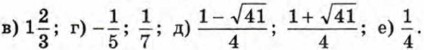 Ответы534. 535. 536. а) 0,2; 2; б) -6; 2,5; 537. а) При х = 5 и x = 6; 538. а) При x = 2 и х = 9; б) при х = 0,5 и х = 2. 539. 540. 541. 542. а) -0,2; 2; б) -7; 2; 6 в) 3 - 3√2; 3 + 3√2; г) -4; 5; д) 16; 36; 543. а) 1; 25; 544. а)-0,2; 1,7; 545. а)-8; 3; 546. а) -1; 23; 547. а) x1 ≈ -0,36, x2 ≈ 0,56; б) x1 ≈ -2,78, х2 ≈ -0,72; в) у1 ≈ -1,26, у2 ≈ 1,59; г) у1 ≈ -9,20, у2 ≈ 1,20. 550. а) х1 ≈ 1,35, х2 ≈ 6,65; б) у1 ≈ 0,78, у2 ≈ 3,22. 551. 552. а) 7; б) 0,6; 2; 555. а) Не существует; б) не существует; в) а — любое число 556. 7,5. 557. а) √3 + √2; б) 2 + 3√5.