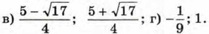 Ответы600. г) 1; д) -27; -1; е) -0,2 601. а)-12,5; б) 3; 4; в) 6; г)-1; 3,5; 602. 603. а) 3 - √5; 3 + √5; б) -6; 5; 605. а) 6; 606. а) 2; б) 1; в) -11; г) 6. 607. а)-3; 608. а) 1; 7; б) 1 - √14; 1 + √14; 609. 610. a) -√2; √2; б) -3; 3. 615. а) √y б) √y