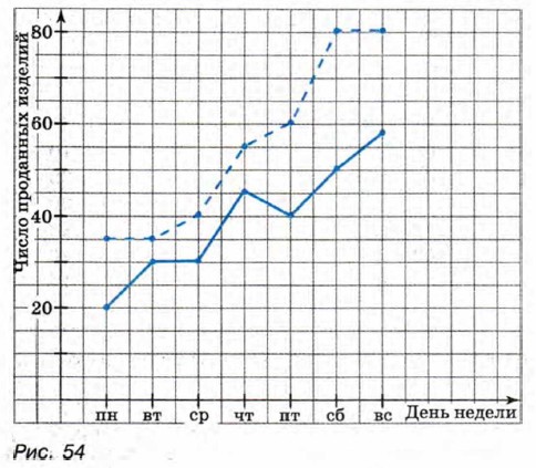 1051. На рисунке 54 построены полигоны, иллюстрирующие продажу магазином в течение недели компьютеров (сплошная линия) и телевизоров (пунктирная линия). Укажите два дня, следующие друг за другом, когда во второй день по сравнению с первым: а) число проданных телевизоров возросло больше, чем число проданных компьютеров;