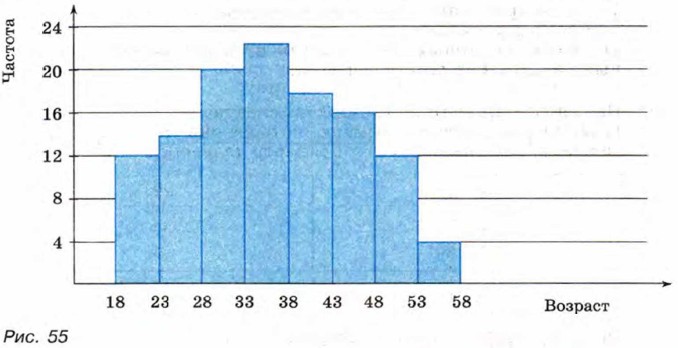 Постройте гистограмму, характеризующую распределение призывников по росту. 1054. На гистограмме (рис. 55) представлены данные о распределении рабочих цеха по возрастным группам. Пользуясь гистограммой, найдите: а) число рабочих цеха в возрасте от 18 до 23 лет; от 43 до 48 лет;