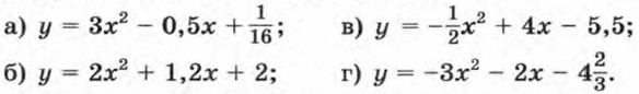 248. По графику функции у = ах2 + bх + с (рис. 50, а, б) определите знаки коэффициентов а, b и с. Ответы229. а) При а = -0,28; б) при а = 3; в) при а = -2; г) при а = 0,001. 238. а) При с > 13; б) при с > 8. 239. При b = -12, с = 24. 240. При а = 2. 241. При а > 0 и с ≤ 0; при а < 0 и с ≥ 0. 242. При а = -6 и b = 26.
