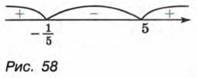 (рис. 57, а). Покажем знаком «плюс», что в крайнем справа промежутке функция принимает положительное значение, а затем, двигаясь справа налево, укажем знак функции в каждом из промежутков (рис. 57, б). Получим, что множеством решений неравенства является объединение промежутков (-4; 0) и (0,5; +∞). Ответ: (-4; 0) ∪ (0,5; +∞). Пример 3. Решим неравенство (5х + 1)(5 - х) ≥ 0.