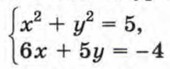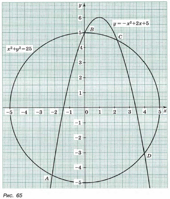 Построим в одной системе координат графики уравнений х2 + у2 = 25 и у = -х2 + 2х + 5 (рис. 65). Координаты любой точки окружности являются решением уравнения х2 + у2 = 25, а координаты любой точки параболы — решением уравнения у = -х2 + 2х + 5. Значит, координаты любой точки пересечения окружности и параболы удовлетворяют как первому уравнению системы, так и второму, т. е. являются решением рассматриваемой системы. Используя рисунок, находим приближенные значения координат точек пересечения графиков: А(-2,2; -4,5), В(0; 5), С(2,2; 4,5), D(4; -3). Следовательно, система уравнений имеет четыре решения: