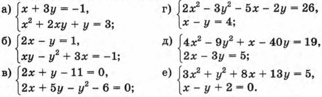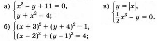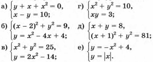 521. При каком значении а окружность (х - а)2 + (у - 3)2 = 16 проходит через точку: а) А(2; 3); б) В(7; -1); в) С(-2; 7); г) D(1; 5)? 522. Найдите целые решения уравнения: а) х2 -у2 = 5; б) х2 - у2 = 8. 523. Решите графически систему уравнений: