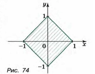 556. Докажите, что множество решений неравенства |x| + |y| ≤ 1 задается фигурой, изображенной на рисунке 74. 557. Изобразите на координатной плоскости множество решений системы неравенств: