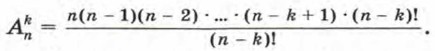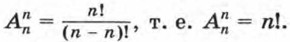 Мы получили формулу для вычисления числа размещений из n элементов по k при k < n. Формула верна и в том случае, когда k = n, если условиться считать по определению, что 0! = 1. Заметим, что размещения из n элементов по n отличаются друг от друга только порядком элементов, т. е. представляют собой перестановки из n элементов. В этом случае по формуле числа размещений получаем, что