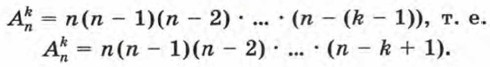 Из составленной таблицы видно, что Число размещений из четырех элементов по три можно найти, не выписывая самих размещений. Будем рассуждать так. Первый элемент можно выбрать четырьмя способами, так как им может быть любой из четырех элементов. Для каждого выбранного первого элемента можно тремя способами выбрать из трех оставшихся второй элемент. Наконец, для каждых первых двух элементов можно двумя способами выбрать из двух оставшихся третий элемент. В результате получаем, что С помощью тех же рассуждений нетрудно подсчитать, сколько можно составить размещений из п элементов по k при k < n. Первый элемент можно выбрать п способами. Так как после этого остается n — 1 элементов, то для каждого выбора первого элемента можно n — 1 способами выбрать второй элемент. Далее, для каждого выбора первых двух элементов можно n — 2 способами выбрать третий элемент (из n - 2 оставшихся) и т. д. Наконец, для каждого выбора первых k — 1 элементов можно n — (k — 1) способами выбрать k-й элемент (из n — (k - 1) оставшихся). Значит,