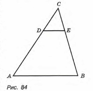 814. В треугольнике АВС проведен отрезок DE, параллельный АВ (рис. 84). Известно, что 815. Пункты А и В находятся друг от друга на расстоянии 2,5 км. Телефонная линия, соединяющая эти пункты, оборвалась в неизвестном месте. Какова вероятность того, что точка разрыва удалена от точки А не более чем на 500 м? 816. На координатной прямой отмечены точки А(0) и В(3). На отрезке АВ наугад выбрана точка С(х). Какова вероятность того, что 0 ≤ х ≤ 1,2?