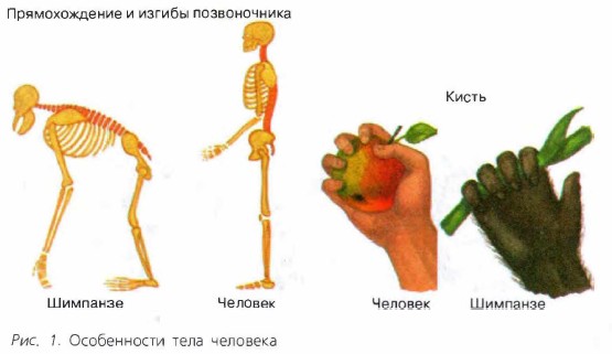 Человек как биологический видЗанимаясь наукой, человек постоянно пытался определить своё место в системе органического мира. Изобретение светового микроскопа и использование его для изучения человека позволили сделать вывод о том, что его организм, так же как и организмы растений, грибов и животных, состоит из множества клеток. Их сходство по химическому составу, строению и процессам жизнедеятельности с клетками животных позволило утверждать, что человека следует отнести к царству животных. Изучение сходства и различий человека с другими животными позволило установить, что он принадлежит к царству Животные, типу Хордовые, классу Млекопитающие, отряду Приматы, семейству Гоминиды, роду Человек и виду Человек разумный (Homo sapiens). Сходство строения человека и животныхОбщий план строения организма человека соответствует плану строения всех позвоночных животных. Опорой тела служит внутренний скелет — позвоночный столб, к которому присоединяются череп и кости поясов конечностей. Центральная нервная система состоит из спинного и головного мозга. У позвоночных животных замкнутая кровеносная система, состоящая из сердца, артерий, капилляров и вен. Тело покрыто кожей, состоящей из многих слоёв клеток. Для человека как представителя млекопитающих характерны следующие признаки: кожа покрыта волосами; имеется четырёхкамерное сердце, снабжающее ткани артериальной кровью, которая не смешивается с венозной; лёгкие имеют альвеолярное строение, что сильно увеличивает дыхательную поверхность и обеспечивает усиленный газообмен. Характерная биологическая черта большинства млекопитающих — живорождение. Зародыш практически всех млекопитающих связан с материнским организмом при помощи плаценты, а новорождённый детёныш питается молоком матери из молочных желёз. Большинство млекопитающих имеют молочные и постоянные зубы, прорезывающиеся в определённом порядке и в определённые сроки. В центральной нервной системе млекопитающих значительного развития достигает головной мозг, особенно его высший отдел — кора больших полушарий. Как и у всех приматов, верхняя губа у человека не прирастает к дёснам. Имеются щёки — приспособления для сосания молока. Носовые отверстия округлые. У человека и узконосых обезьян сходная зубная система: коренные зубы имеют широкие коронки, снабжённые несколькими бугорками. Хватательные конечности приматов обладают большой подвижностью, причём большой палец противопоставлен остальным. Наличие ногтей, а не когтей — характерная особенность строения конечностей представителей отряда приматов. У человека, как и у всех приматов, глазницы обращены вперёд, зрение объёмное и цветное. Отличия человека от животныхПереход предков человека к прямохождению обусловил ряд изменений в его скелете, мышцах, расположении внутренних органов (рис. 1). Мозг человека, по сравнению с другими приматами, имеет большую массу относительно общей массы тела. Мозговой отдел черепа человекапреобладает над лицевым. Нижняя челюсть человека подковообразная, с выступающим подбородком, что связано с речевой деятельностью и развитием мускулатуры языка. Позвоночный столб человека имеет четыре характерных изгиба. У животных таких изгибов нет. Изгибы служат для сохранения человеком равновесия при прямохождении, а также для смягчен