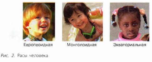 Мускулатура нижних конечностей человека в связи с прямохождением стала более мощной, а её костная основа — более массивной. Ноги человека длиннее, чем руки, которые не достигают в вытянутом положении колен. Ноги заканчиваются стопой в форме свода. Каждый палец на руке человека обладает значительно большей подвижностью, чем у обезьян. 59 РасыИсторически сложившиеся группы людей, различающиеся некоторыми физическими (черты лица, цвет кожи, глаз, волос, форма волос и др.) и физиологическими признаками, называют расами. Для каждой расы характерно единство происхождения и формирования на определённой территории. В современном человечестве выделяют три основные расы: европеоидную (евразийскую), монголоидную (азиатско-американскую) и экваториальную (австрало-негроидную) (рис. 2). Между тремя основными группами рас существуют переходные расы. Иногда австралоидов и негроидов выделяют в отдельные расы.