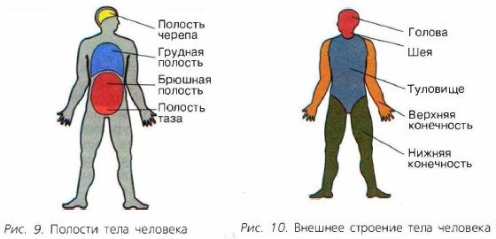 Организм человекаВ теле человека различают осевую часть (голова, шея, туловище) и конечности (верхние — руки и нижние — ноги) (рис. 10). Благодаря согласованной работе всех систем органов организм человека всегда отвечает на изменения, которые происходят в нём самом и окружающей его среде. То есть вся работа систем органов постоянно направлена на достижение результата, полезного для всего организма. Для этого несколько систем органов временно объединяются в функциональную систему. Одной из таких систем обеспечивается, например, бег человека. При этом временно объединяется и согласуется работа органов опоры и движения, кровеносной, нервной, дыхательной, выделительной и других систем. Новые понятия Органы. Полости тела. Системы органов. Функциональная система Ответьте на вопросы 1. Какие системы органов вы знаете? Охарактеризуйте их основные функции. 2. Какие части различают во внешнем строении тела человека? 3. Что такое функциональные системы и какова их роль в жизнедеятельности человека? Выполните задание Назовите известные вам органы человека и охарактеризуйте их местоположение в организме, используя имеющиеся наглядные пособия. ПОДУМАЙТЕ! Почему нарушение работы какой-либо системы органов может привести к нарушению жизнедеятельности или даже гибели всего организма?