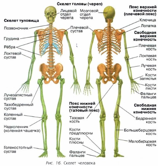 Скелет человекаСкелет человека состоит из костей и соединяющих их связок — хрящей. В нём различают несколько отделов: скелет головы, скелет туловища и скелет конечностей (рис. 16). По весу скелет среднего человека составляет приблизительно 15% от массы тела. Всего в скелете человека насчитывают около 200 костей, но их точное число указать нельзя, так как у разных людей (в некоторых отделах) оно может различаться.